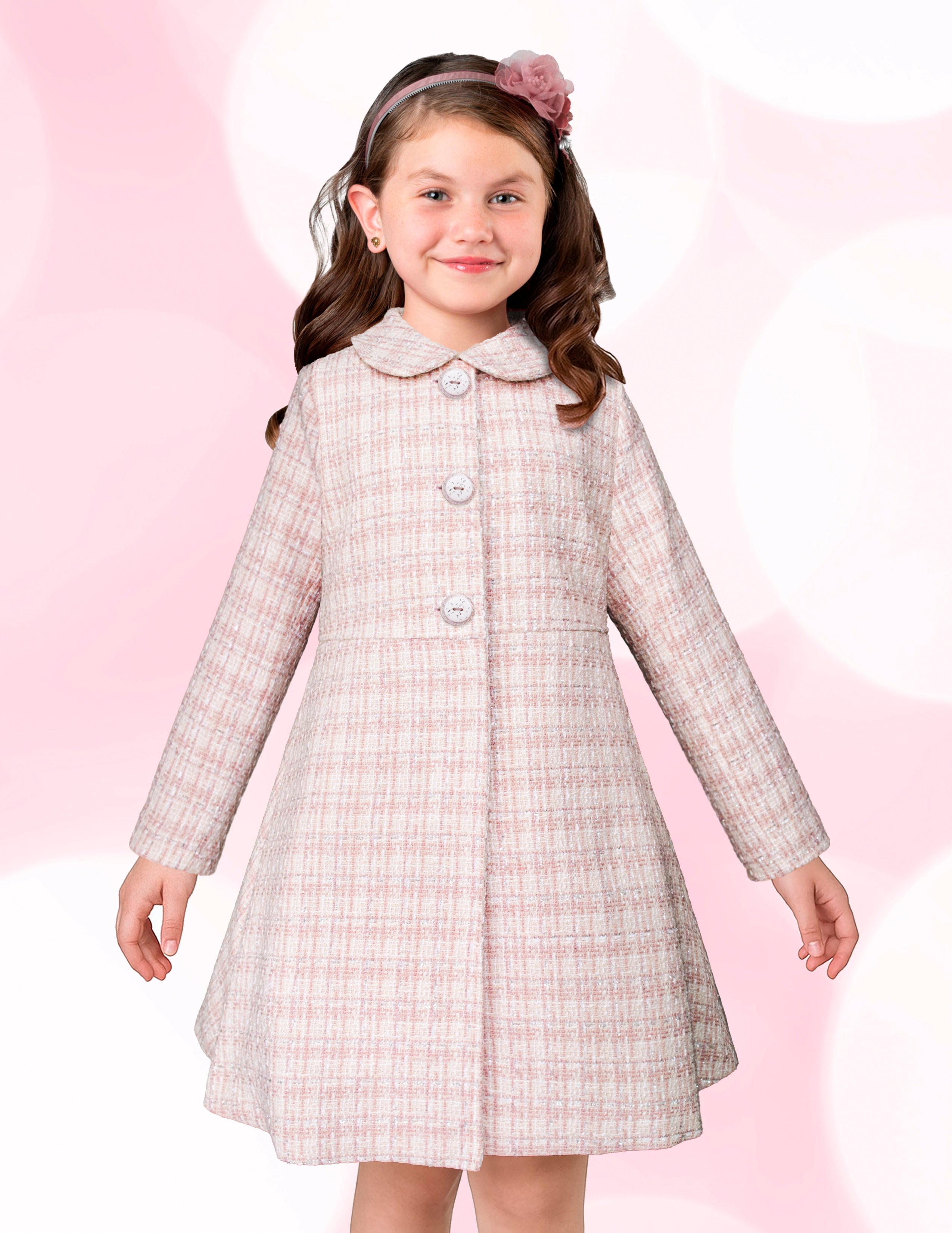 Este abrigo de fiesta para niña Gerat combina elegancia y calidez en un diseño clásico con textura tipo tweed en tonos rosa pastel. Ideal para eventos formales, ceremonias o temporadas de otoño-invierno, este modelo presenta botones grandes al frente, cuello redondo estilo Peter Pan y un corte acampanado que aporta sofisticación y movimiento.