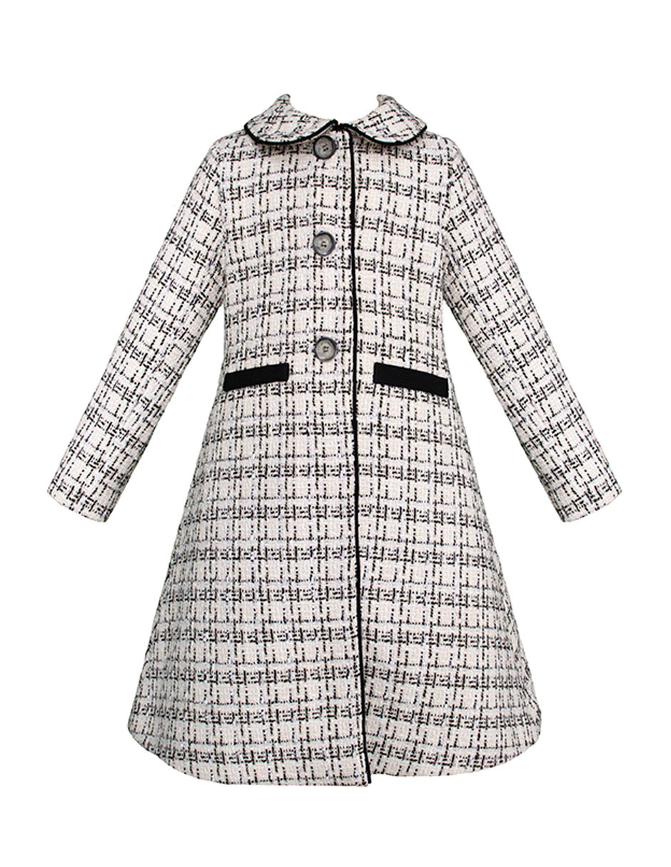 Dale un toque clásico y sofisticado al look de tu niña con este abrigo estilo tweed en blanco y negro de Gerat. Diseñado para las pequeñas con estilo, este abrigo de invierno combina calidez, elegancia y confort en una prenda perfecta para eventos especiales o salidas formales. Cuenta con botones al frente, bolsillos decorativos con ribete negro y un cuello redondeado encantador con vivos contrastantes.