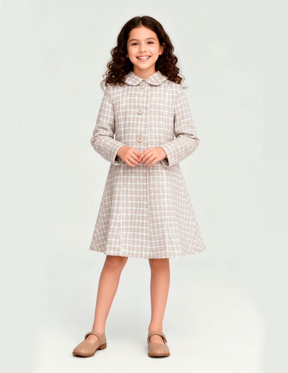 Elegancia juvenil en cada botón. Este abrigo con patrón escocés en tonos café y blanco es la opción ideal para niñas más grandes que buscan estilo y sofisticación. Su diseño moderno con botones grandes, corte recto y cuello clásico es perfecto para días fríos con mucho estilo.