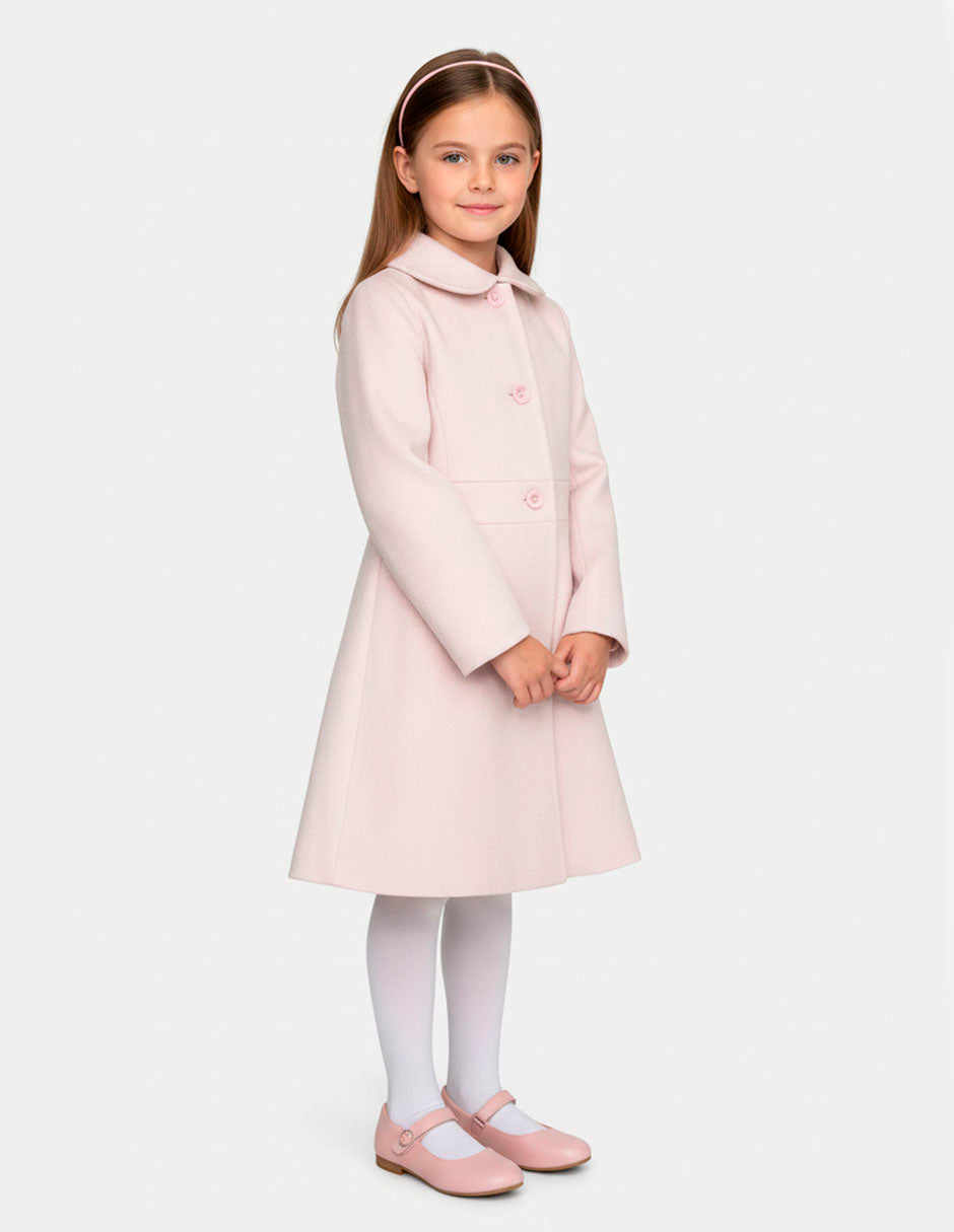 Este abrigo juvenil para niña en tono rosa pastel de Gerat es la prenda perfecta para complementar sus looks de temporada con elegancia y dulzura. Confeccionado con un tejido cálido y suave al tacto, presenta un corte tipo A que estiliza la silueta, botones frontales a tono y cuello redondo delicado que le da un toque clásico. Ideal para ocasiones especiales, ceremonias o para el día a día en climas frescos. Disponible en tallas 10, 12 y 14.