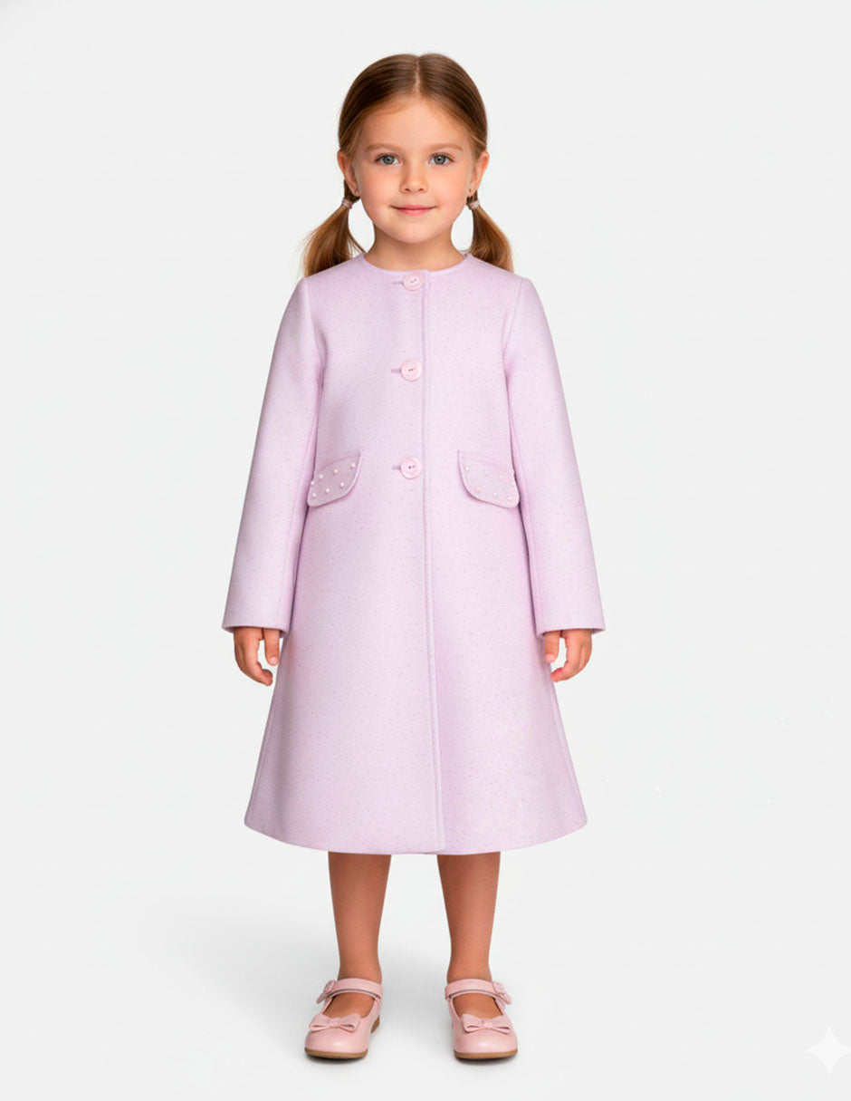 Este elegante abrigo rosa claro de fiesta para niña de Gerat es la prenda ideal para complementar sus looks en eventos especiales durante la temporada de frío. Su diseño minimalista con bolsillos decorados con perlas, botones forrados y corte estructurado lo convierten en una pieza sofisticada y versátil.