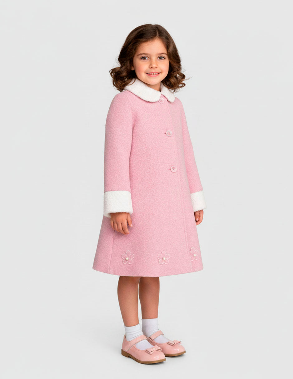 Este encantador abrigo rosa de invierno para niña de Gerat combina calidez, estilo y un diseño lleno de ternura. Confeccionado en tela tipo lana, incluye detalles suaves en cuello y puños tipo borreguillo, flores bordadas con perlas en el dobladillo y un moño decorativo en la parte trasera que aporta un toque elegante y femenino.