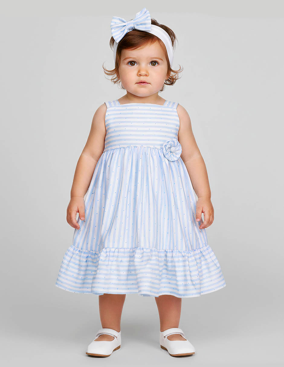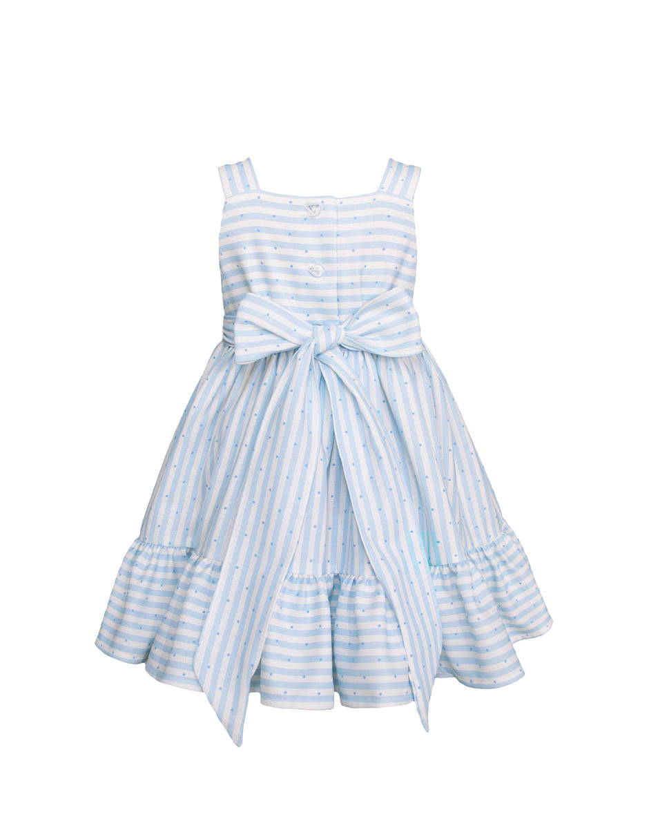 Esta hermosa bata para bebé niña en color azul cielo con delicadas rayas y pequeños lunares es perfecta para ocasiones especiales o eventos familiares. Su diseño clásico con falda amplia, olan en la parte inferior y aplicación floral en la cintura crea un look tierno y sofisticado.