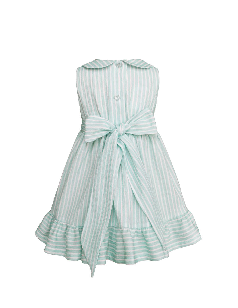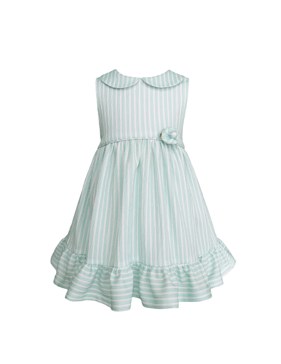Su delicado diseño de rayas verticales estiliza la silueta, mientras que el cuello tipo Peter Pan aporta un toque clásico y encantador. La falda con ligero vuelo y el detalle floral lateral realzan el diseño, creando una bata tierna y elegante ideal para cualquier ocasión.