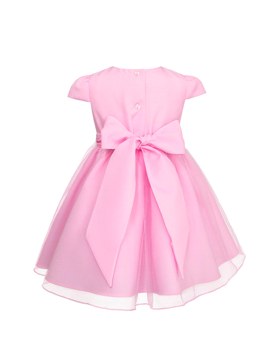 Esta hermosa bata de fiesta para bebé Gerat está diseñada para capturar los momentos más especiales de sus primeros eventos. Confeccionada en un delicado tono rosa pastel, combina un cuerpo suave y estructurado con una falda de tul vaporosa, adornada con aplicaciones florales y un moño central que aportan un encanto único.