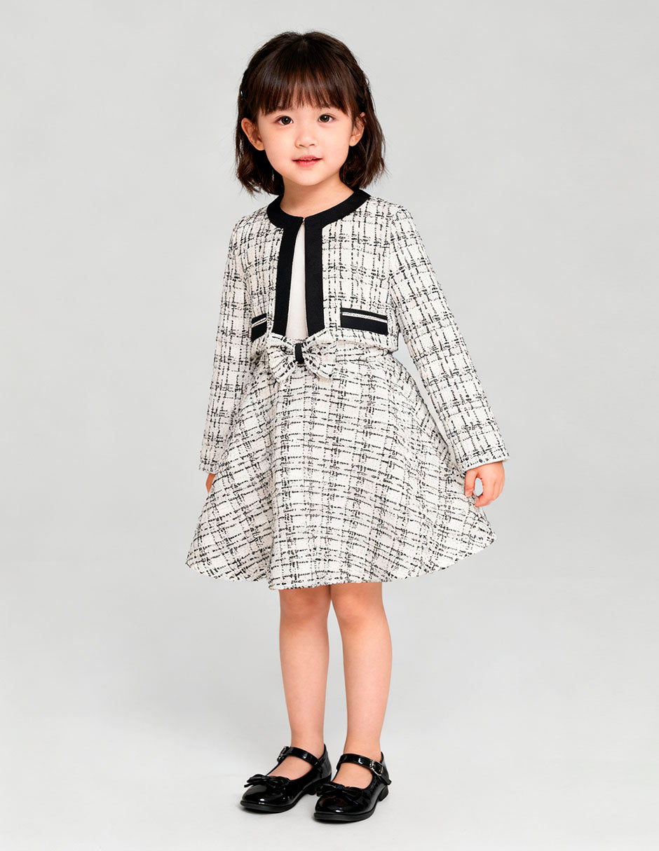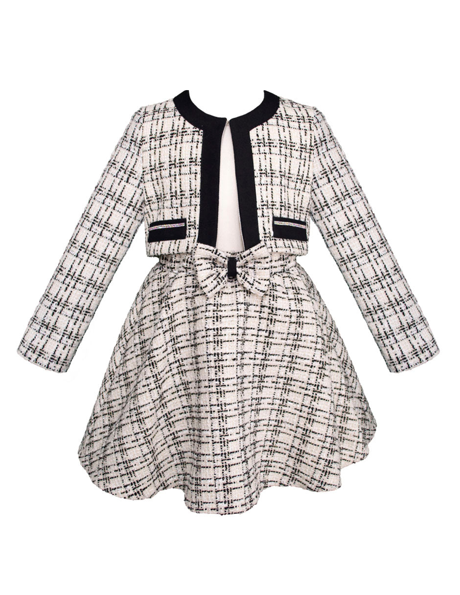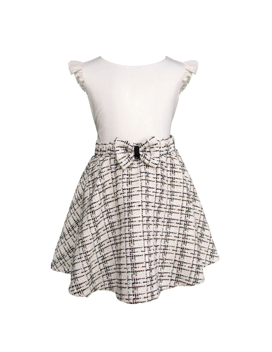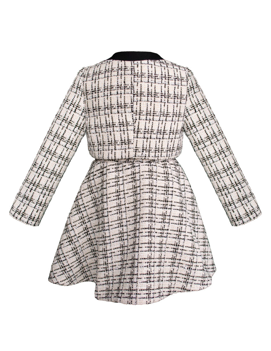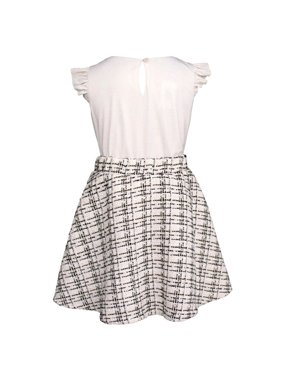 Conjunto elegante de 3 piezas para niña de la marca Gerat, que incluye una blusa blanca con vuelos, falda tipo línea A con moño frontal y saco corto estilo Chanel en tweed blanco con negro. Ideal para eventos formales, presentaciones o celebraciones donde tu pequeña brillará con sofisticación. Disponible en tallas 6, 8, 10 y 12.