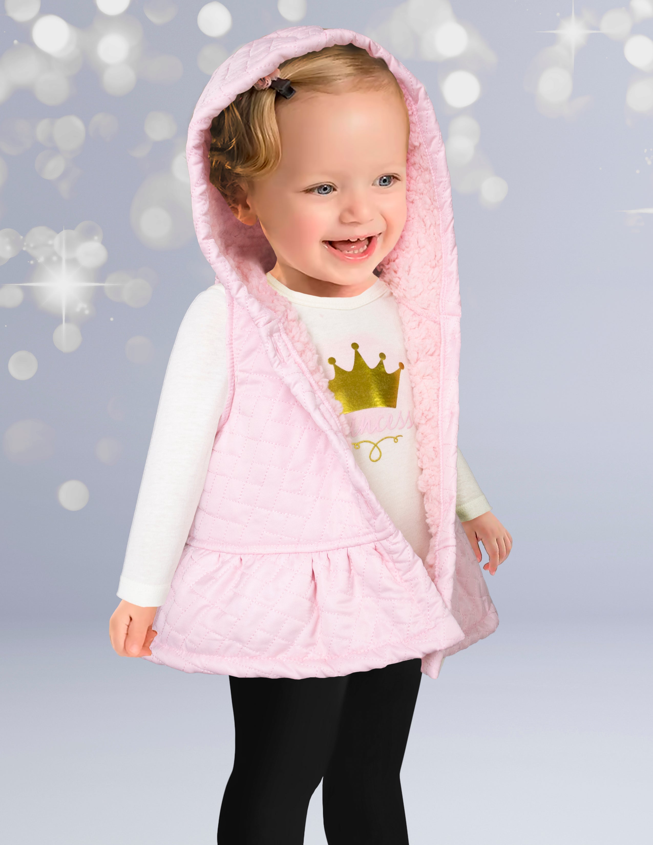 Este encantador conjunto Gerat para bebés de 12 a 18 meses es perfecto para mantener a tu pequeña cómoda y con estilo. Incluye un chaleco acolchado en color rosa con capucha y volante en la cintura, ideal para agregar calidez en días frescos. El body blanco de manga larga con estampado de corona dorada y la palabra "Princess" es suave y delicado con la piel de tu bebé. Los leggings negros completan este outfit versátil y práctico, ideal para cualquier ocasión. ¡Dale a tu princesa el look perfecto con este adorable conjunto!