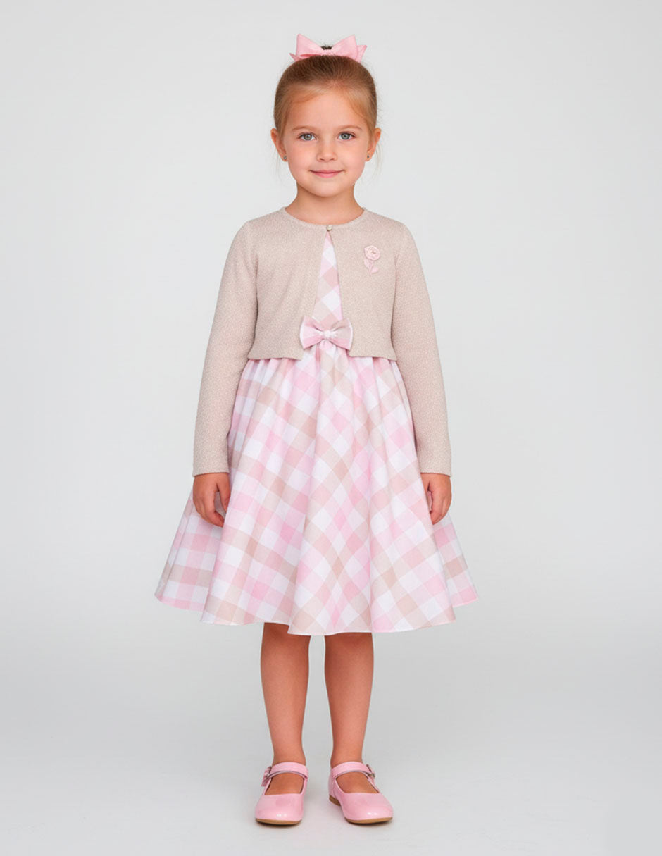 Haz que tu pequeña deslumbre con este hermoso vestido Gerat en tonos rosa y beige, acompañado de un elegante suéter tejido. El diseño combina un vestido de corte amplio con estampado de cuadros rosas y un delicado suéter en color beige con aplicación floral, ideal para lucir en ceremonias, eventos especiales o celebraciones familiares.