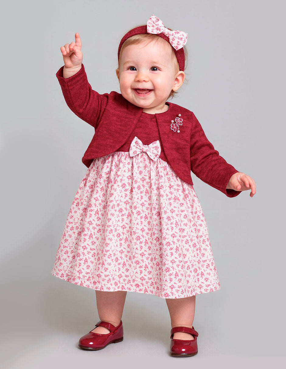 Hermoso vestido bata Gerat con torero tejido en tono vino, ideal para bebés niñas. El vestido floral blanco con rosas pequeñas combina perfectamente con el torero de manga larga, decorado con moños y flores bordadas. Incluye diadema con moño para completar el look. Perfecto para eventos especiales, salidas familiares o sesiones de fotos.