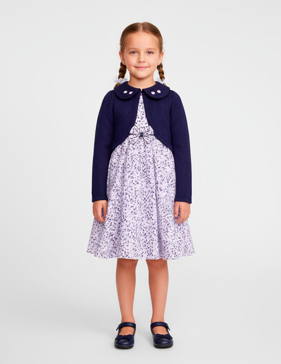 Haz que tu pequeña deslumbre con este hermoso vestido floral con torero tejido azul marino de Gerat, ideal para eventos especiales, fiestas y momentos memorables. El vestido presenta un diseño sin mangas con estampado de flores en tonos morados y lilas, realzado por un moño central que le da un toque sofisticado.