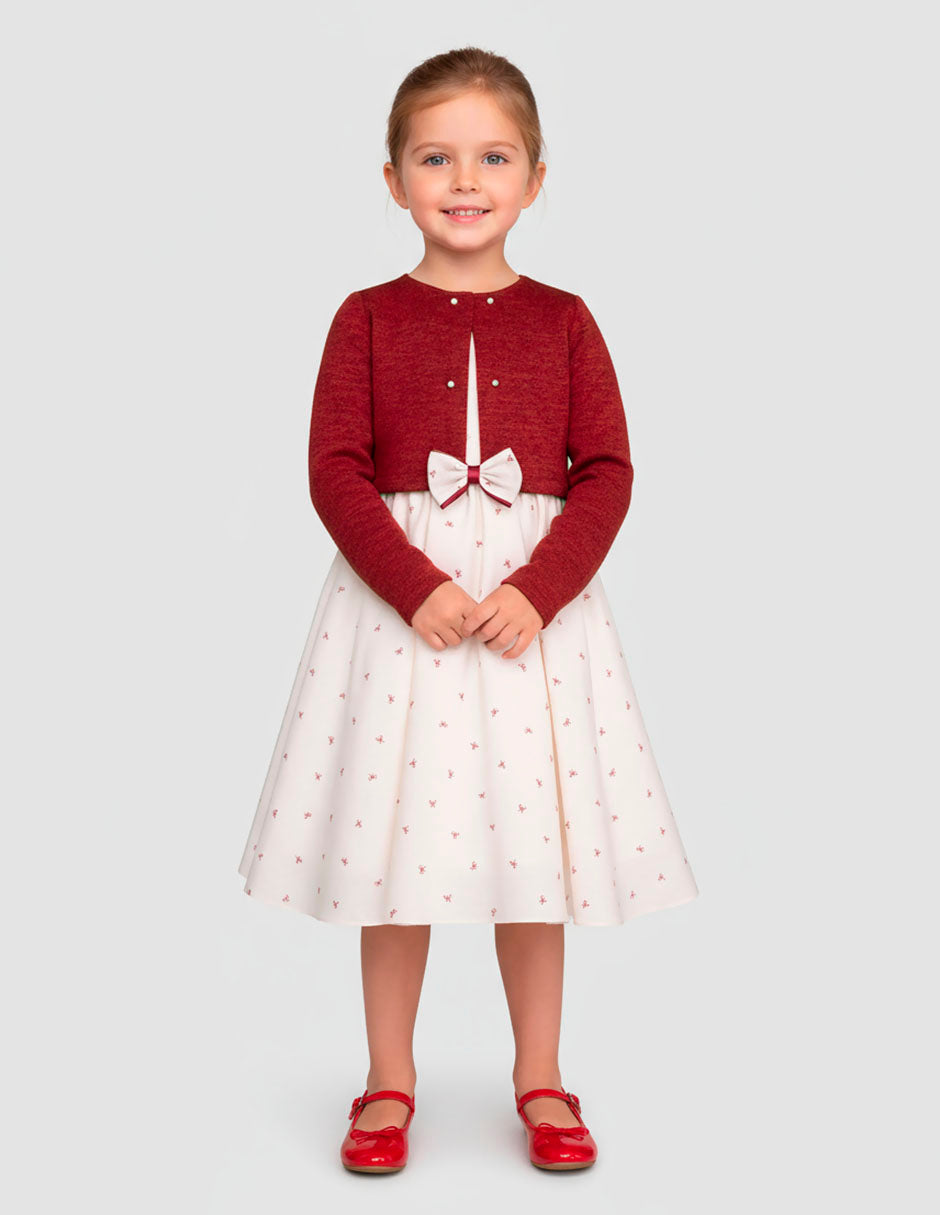 Haz que tu pequeña brille con elegancia y distinción con este encantador vestido con torero para niña de la marca Gerat. Diseñado para ocasiones especiales, este conjunto incluye un vestido sin mangas en tono marfil con delicados moños bordados en color vino y un lazo central que aporta un toque de dulzura.
