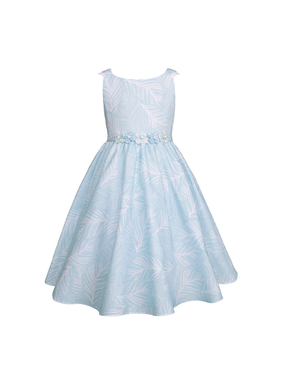 Haz que cada momento especial brille con este hermoso vestido azul cielo para niñas, diseñado para resaltar la dulzura y elegancia de tu pequeña. Su delicado estampado de hojas en tono blanco aporta un toque sofisticado y fresco, mientras que la aplicación floral en la cintura añade un detalle encantador y femenino.