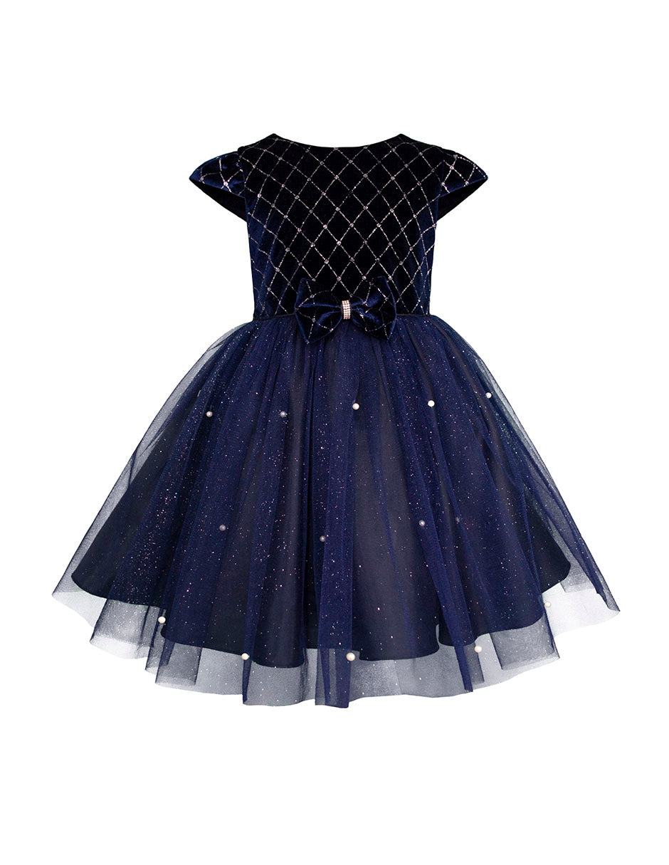 ¡Haz que tu pequeña deslumbre como una princesa con nuestro vestido de fiesta azul marino modelo 4433! Este encantador diseño combina un elegante cuerpo de terciopelo con bordado en rombos y una falda de tul brillante adornada con perlas que capturan la luz con cada paso.