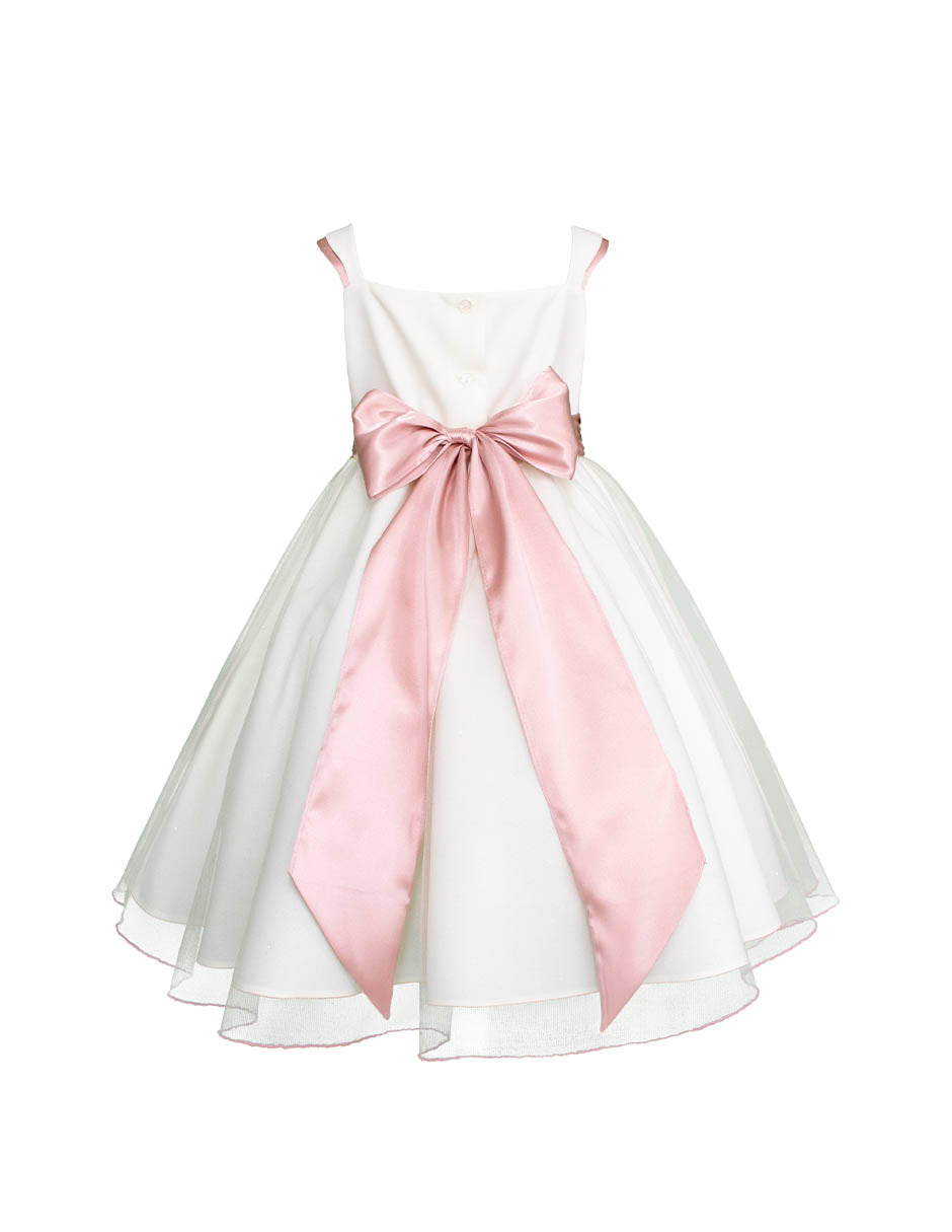 El corpiño liso con tirantes finos aporta un look limpio y sofisticado, mientras que el moño central en palo de rosa realza la cintura con un toque encantador. La falda de tul ligero con aplicaciones florales añade movimiento, dulzura y un acabado etéreo ideal para celebraciones de primavera.