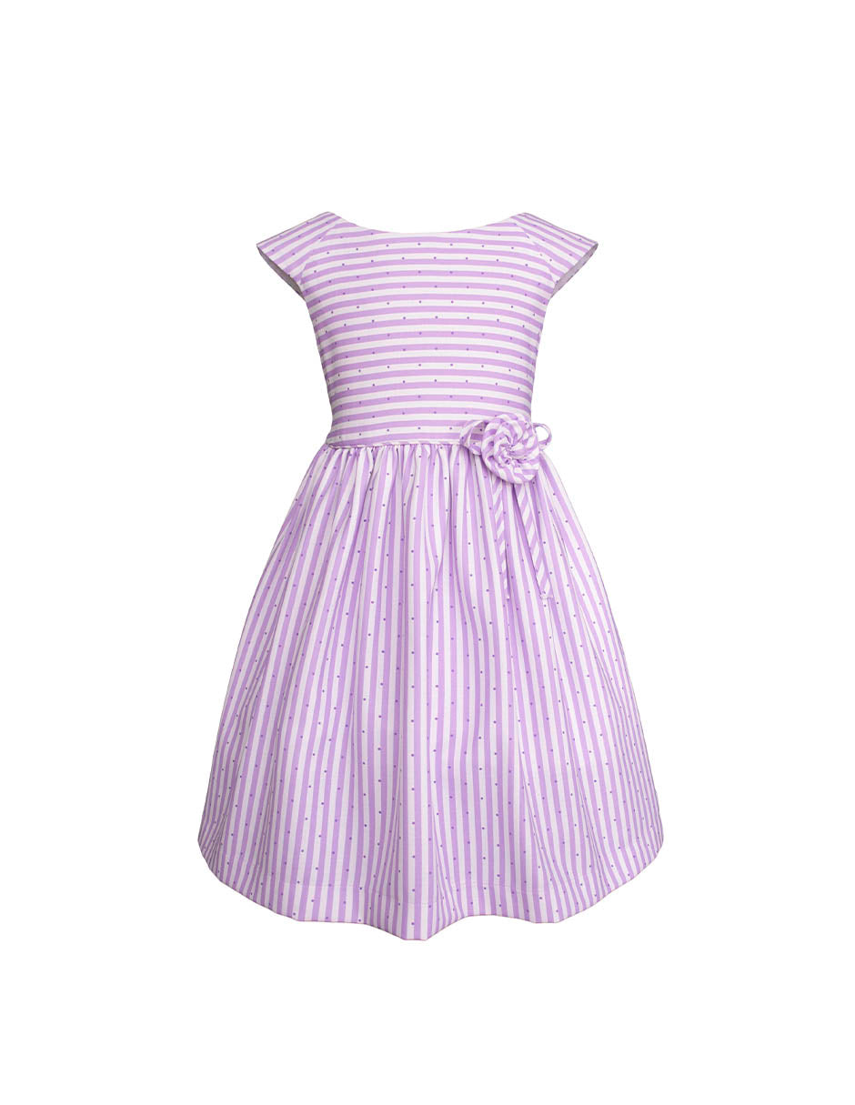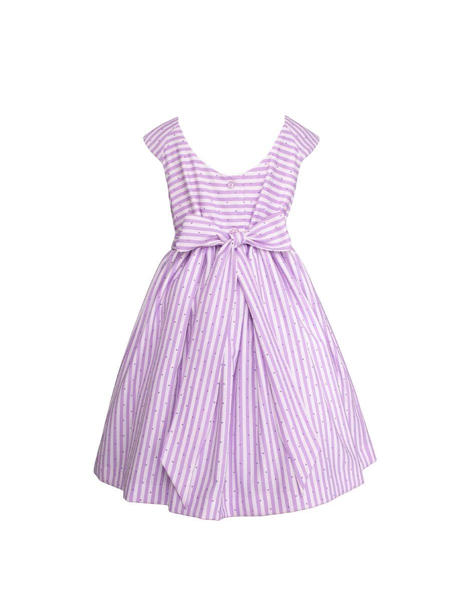 Frescura y elegancia para los días de sol. Este vestido de corte clásico es una pieza esencial en el guardarropa de cualquier niña. Con un diseño de rayas verticales en color lila y un sutil patrón de puntos, combina la comodidad de una prenda casual con los detalles de un vestido de ocasión.