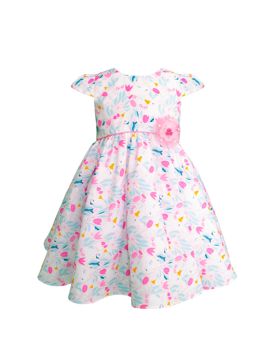 Este encantador vestido para bebé es perfecto para vestir sus primeros momentos especiales con dulzura y estilo. Con un delicado estampado floral multicolor, corte cómodo y caída suave, es ideal para la primavera y verano.