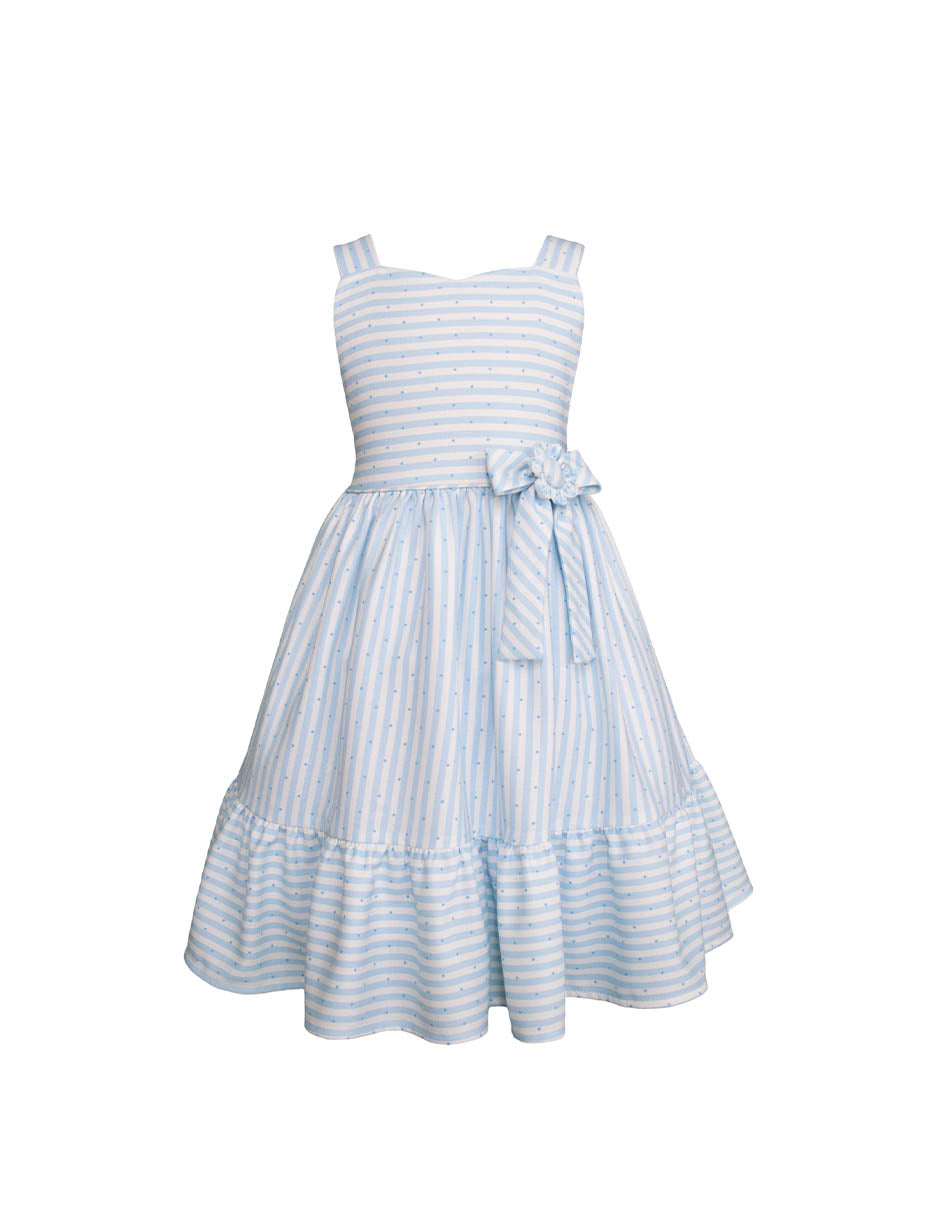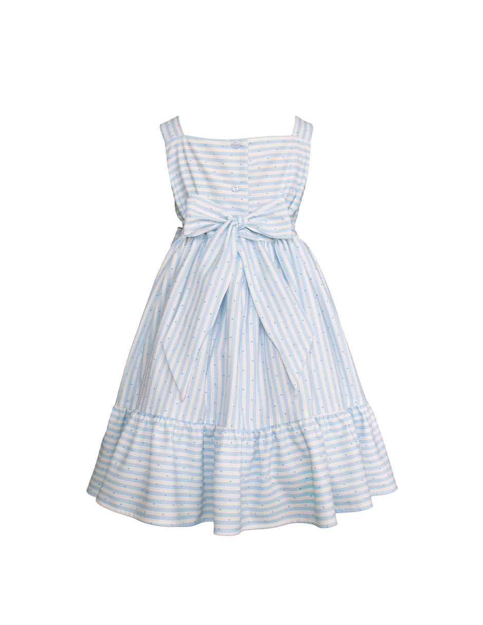 Su delicado diseño combina un elegante patrón de rayas sutiles con una falda amplia de caída ligera, creando un estilo clásico y sofisticado. El moño lateral añade un detalle femenino que realza el diseño, mientras que su corte sin mangas permite mayor comodidad y libertad de movimiento.