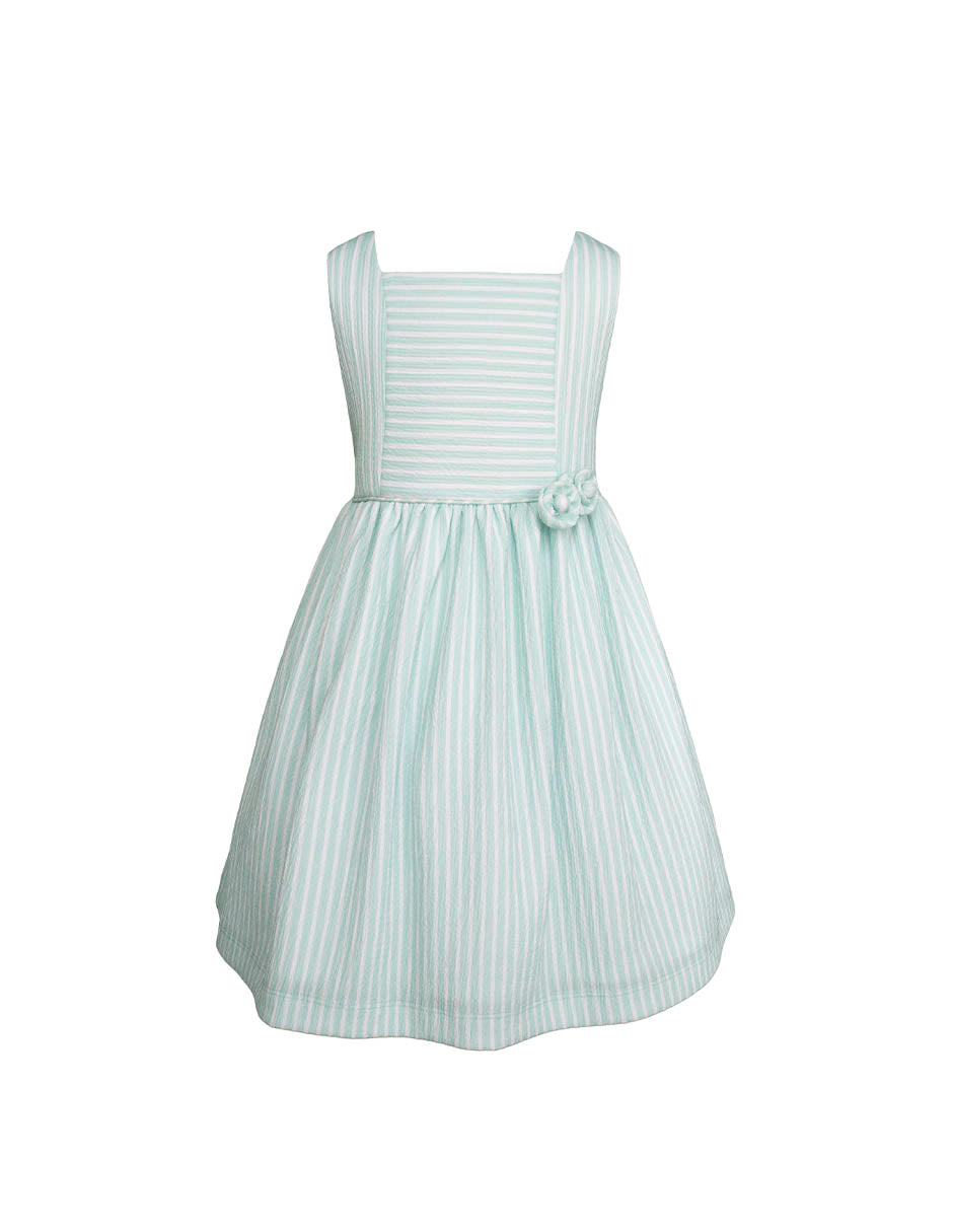 Su hermoso patrón de rayas verticales sutiles estiliza el diseño, mientras que la falda amplia con vuelo y movimiento natural aporta un toque romántico y sofisticado. El detalle floral lateral añade un acabado delicado que realza el look sin perder comodidad.