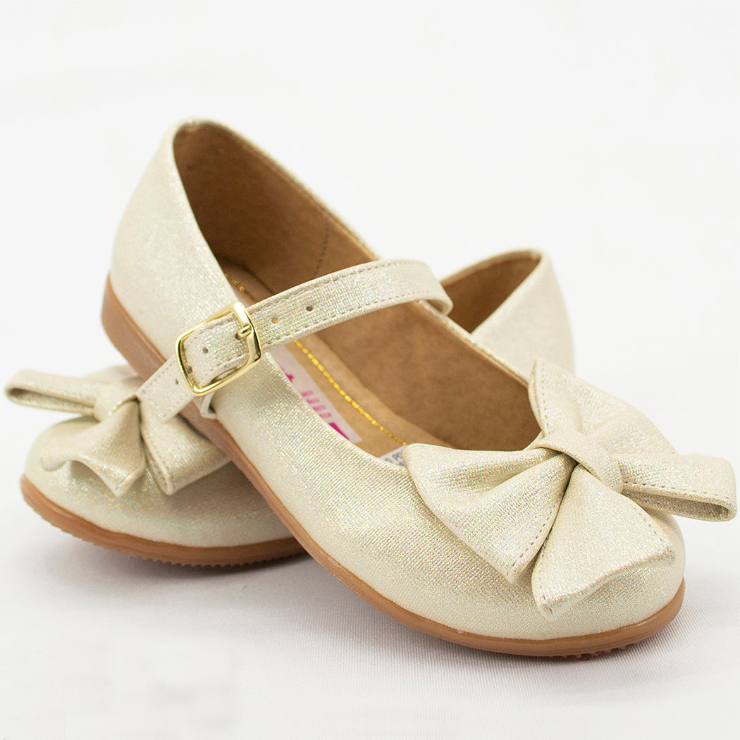 Zapatos Gerat; Estos zapatos de fiesta tienen un acabado en color oro claro con un delicado brillo, adornados con un moño grande y correa ajustable para una combinación perfecta de elegancia y confort. Ideales para añadir un toque de glamour a cualquier ocasión especial.